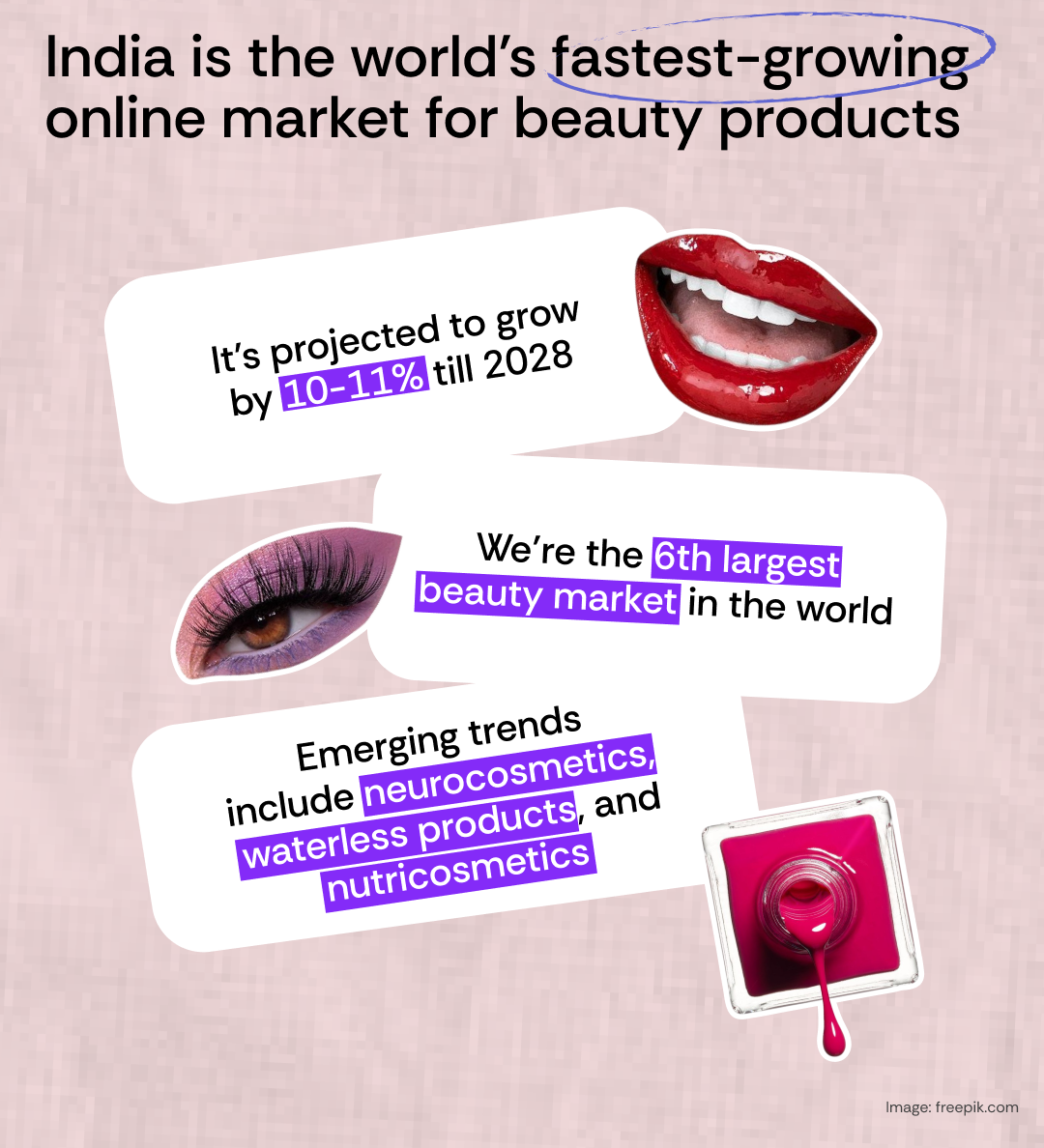 - Thanks to quick and e-commerce platforms, India is the world’s fastest-growing online market for beauty products, projected to grow by 10-11% till 2028.
