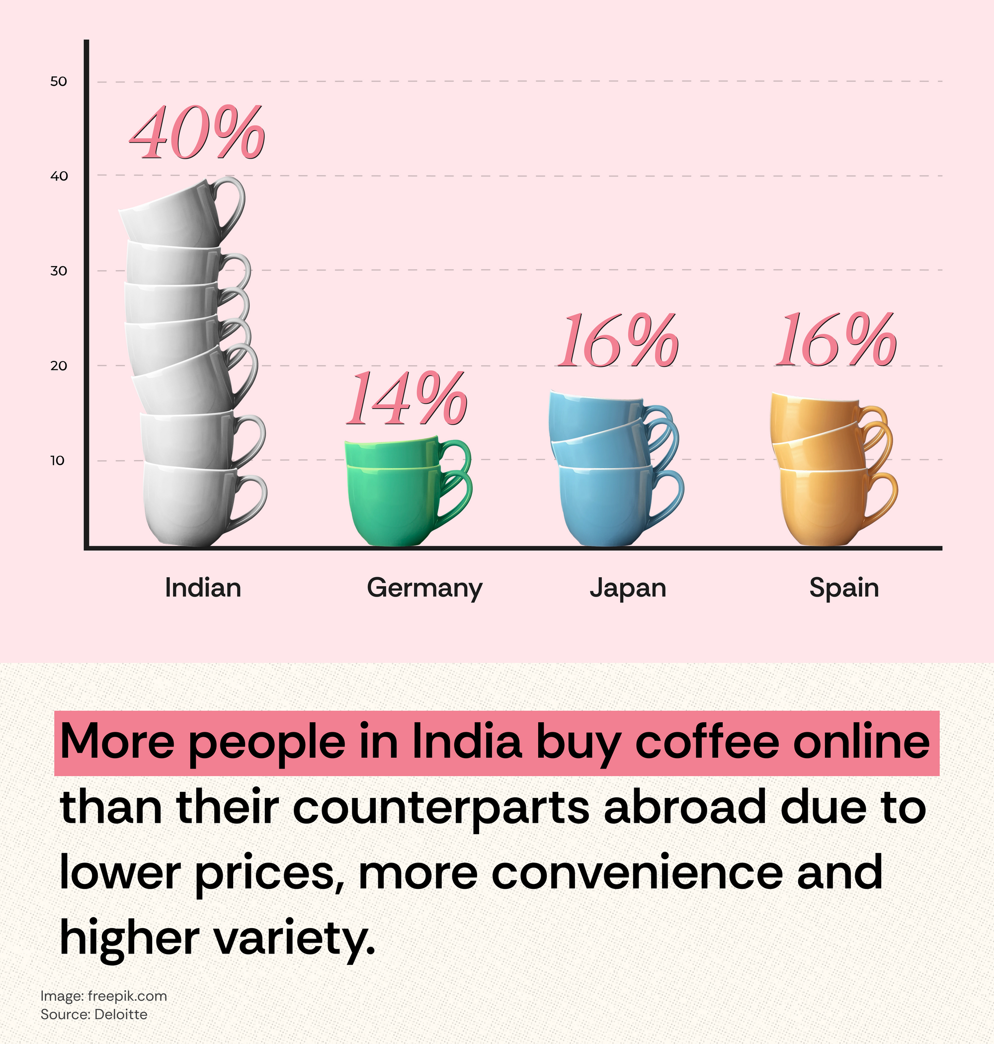 According to a global Deloitte study, 40% of Indians buy their coffee online – beating out the coffee e-commerce markets in Germany (14%), Japan (16%) and Spain (16%) – due to lower prices, more convenience and higher variety. Subscription services also reign supreme where “one in seven online coffee shoppers (15%) indicate they have signed up for regular deliveries.” Even the Coffee Board of India has tagged subscription models as a strategy to boost coffee consumption.