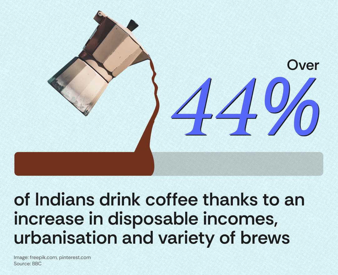 - Thanks to an increase in disposable incomes, urbanisation and variety of brews, over 44% of the Indian population drinks coffee.