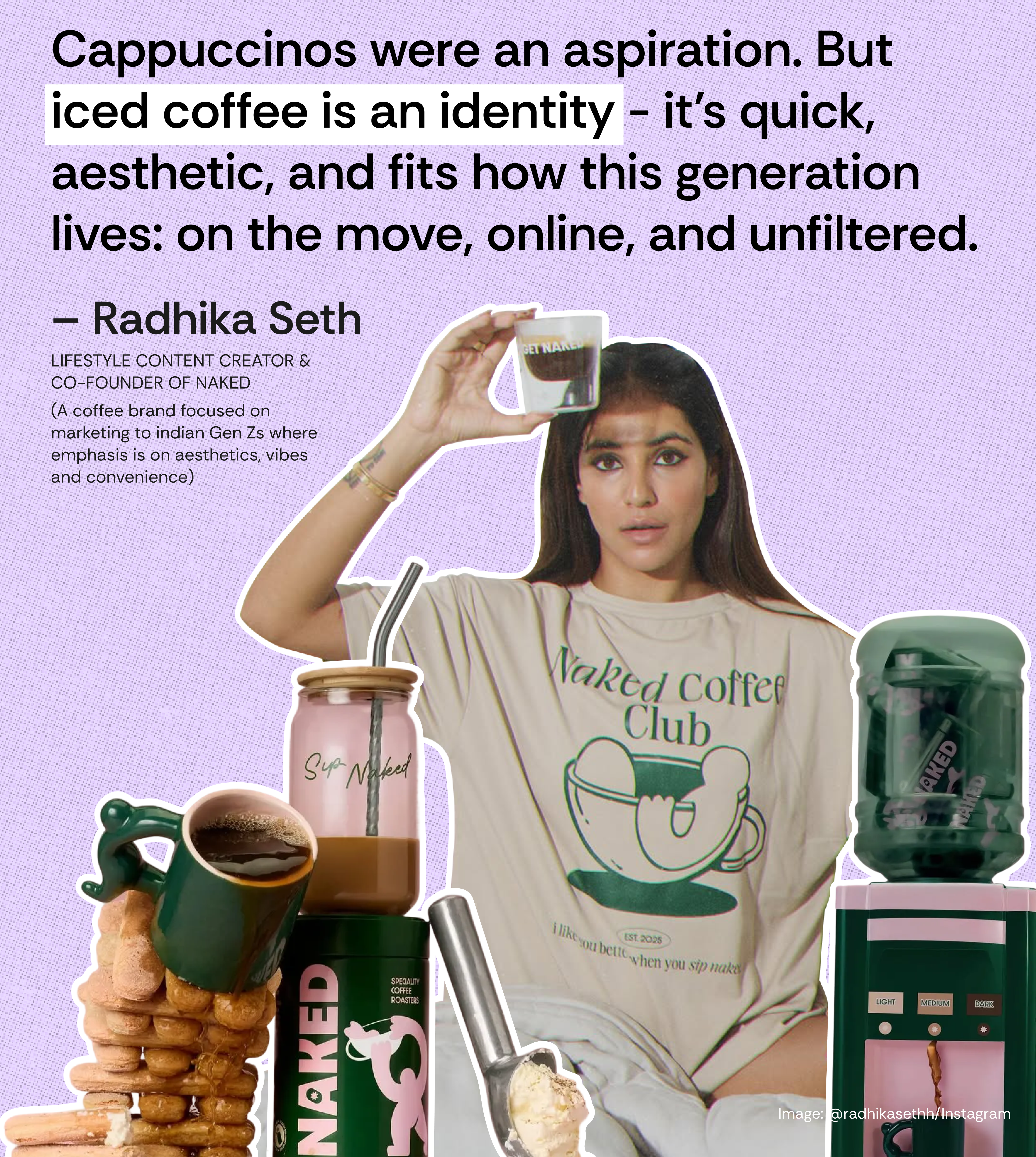 “Cappuccinos were an aspiration. But iced coffee is an identity – it’s quick, aesthetic, and fits how this generation lives: on the move, online, and unfiltered,” says Radhika Seth, lifestyle content creator and one of four co-founders of Naked, a coffee brand focused on marketing to Indian Gen Zs where emphasis is on aesthetics, vibes and convenience. In fact, according to a 2024 Deloitte report, one in five Gen Zs and millennials (22% and 21% respectively) follow the suggestions of influencers when choosing what coffee to buy.